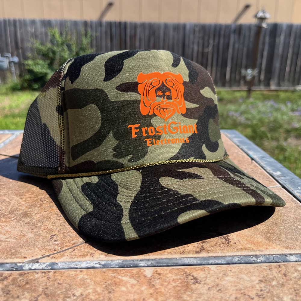 FrostGiant Electronics – orange logo on camo trucker snapback cap.