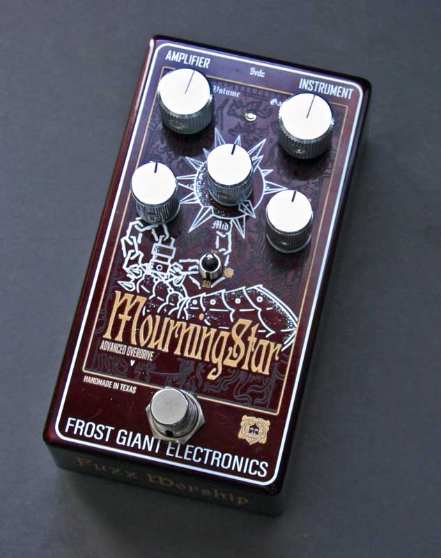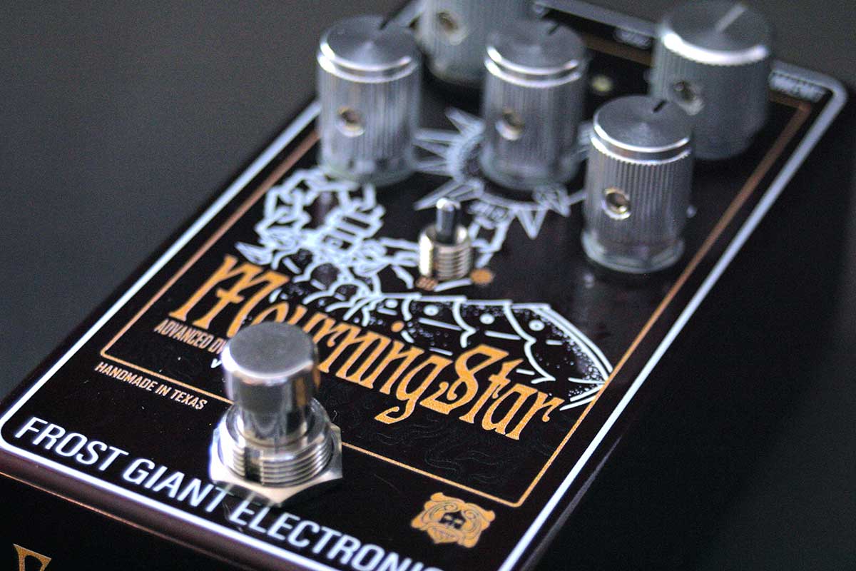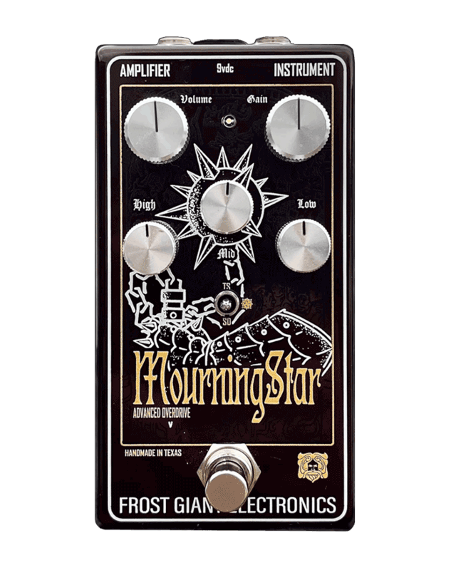 The Mourning Star is a custom overdrive with an active 3 band Baxandall EQ that has a fixed boost that sits behind the volume for more headroom and harmonics, plus a 3 way clipping selection. We designed this pedal to give your amp an extra push into saturation territory without having to mod your amp but also in a familiar package and clipping options to really tailor how the pedal goes into and reacts with your amp. We wanted to offer something that pushes a vintage Plexi as well as sculpt a Mesa Dual Rectifier, but still offer a stack-able pedal for those that use fuzz and distortion pedals for their tone.
